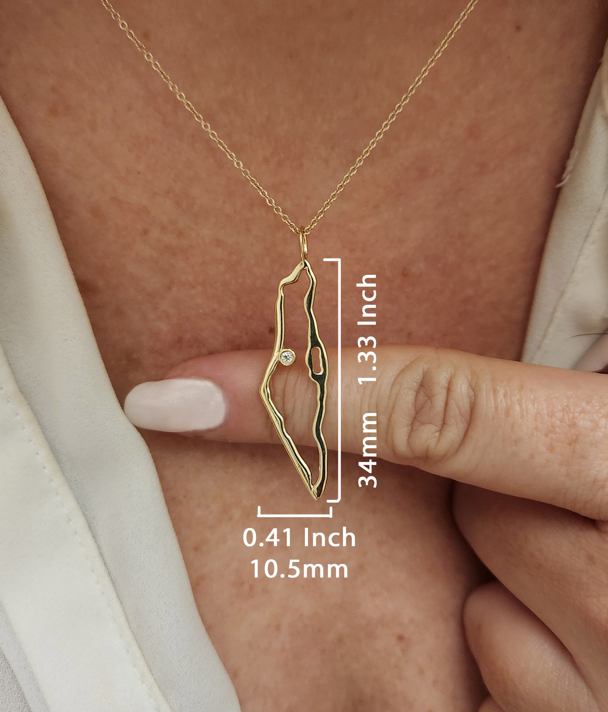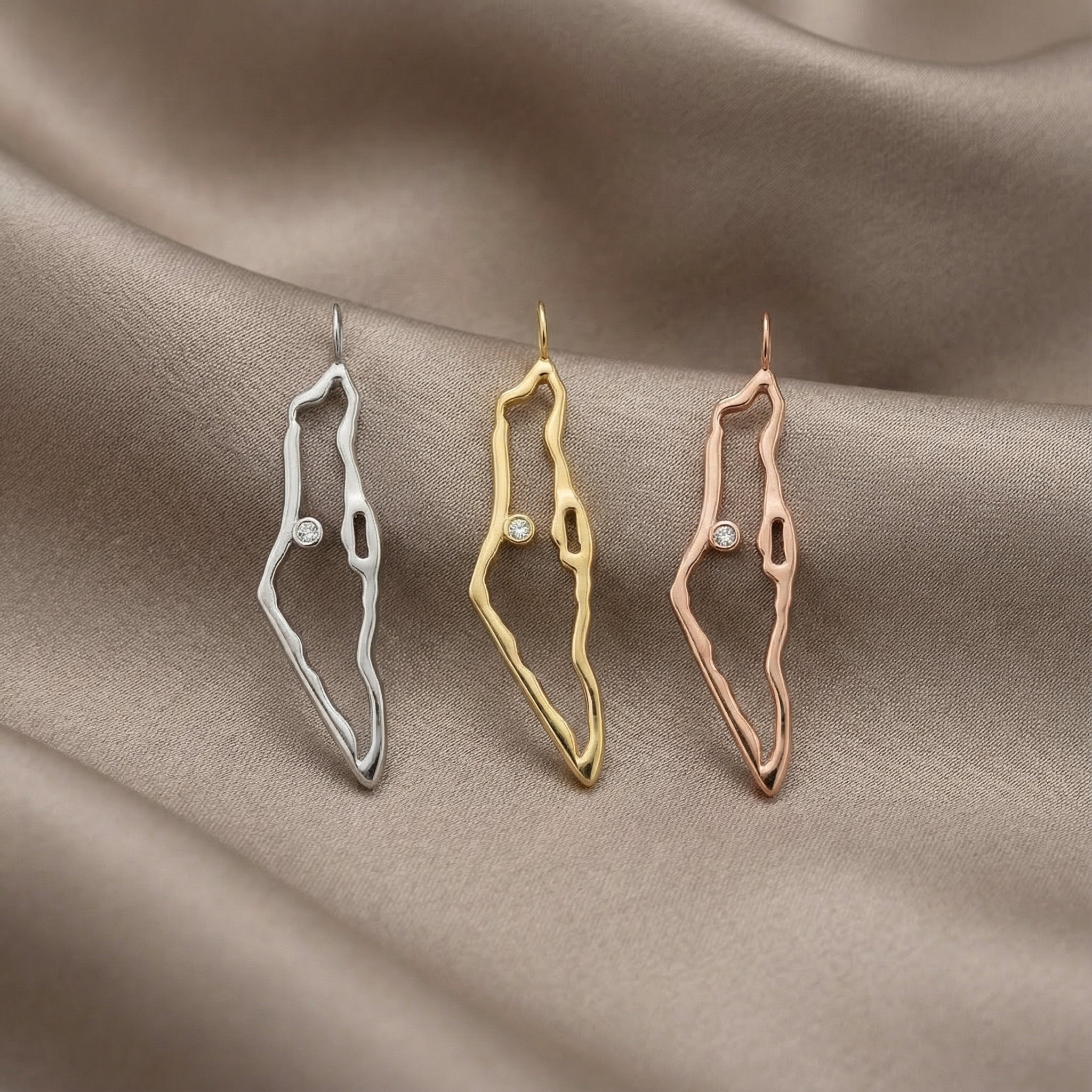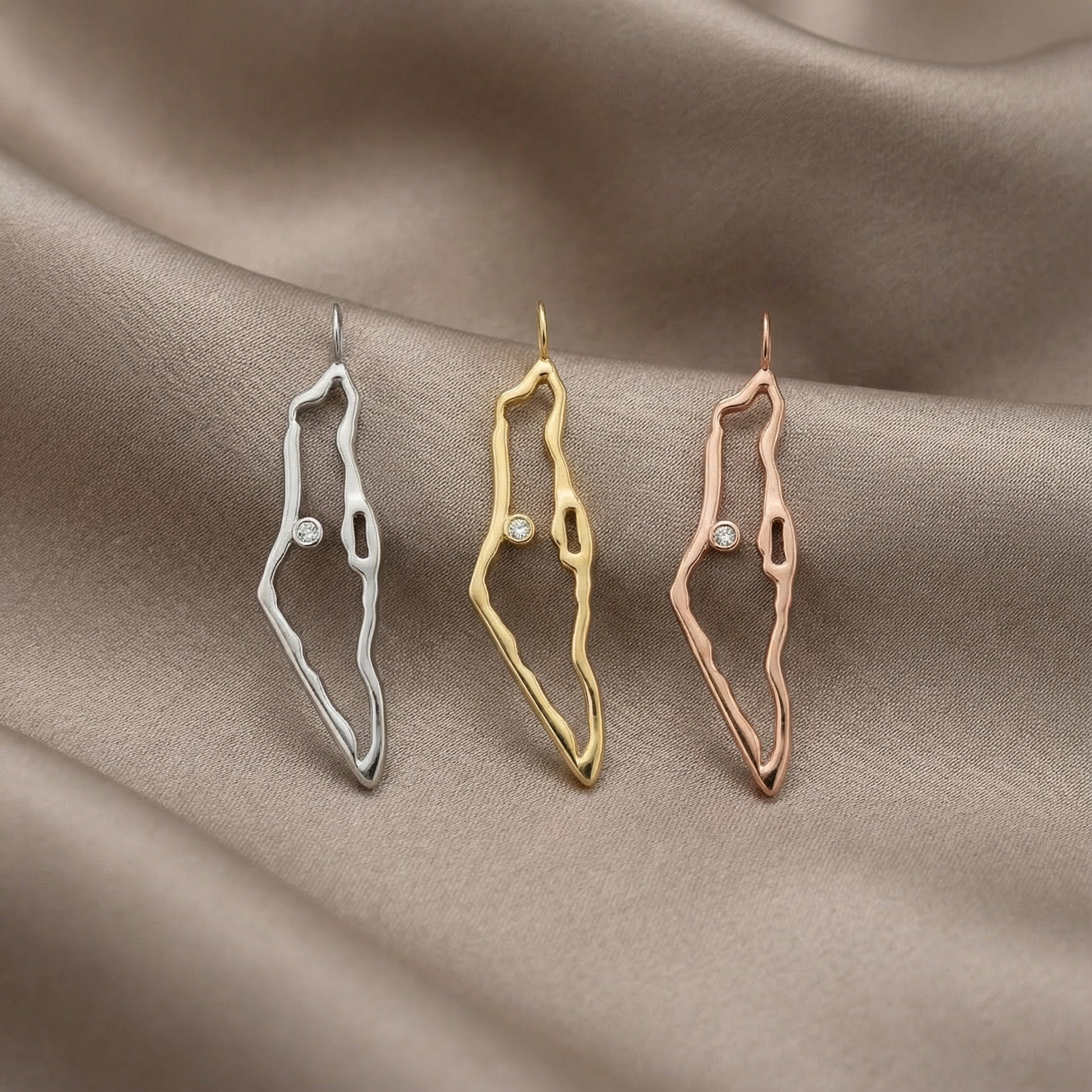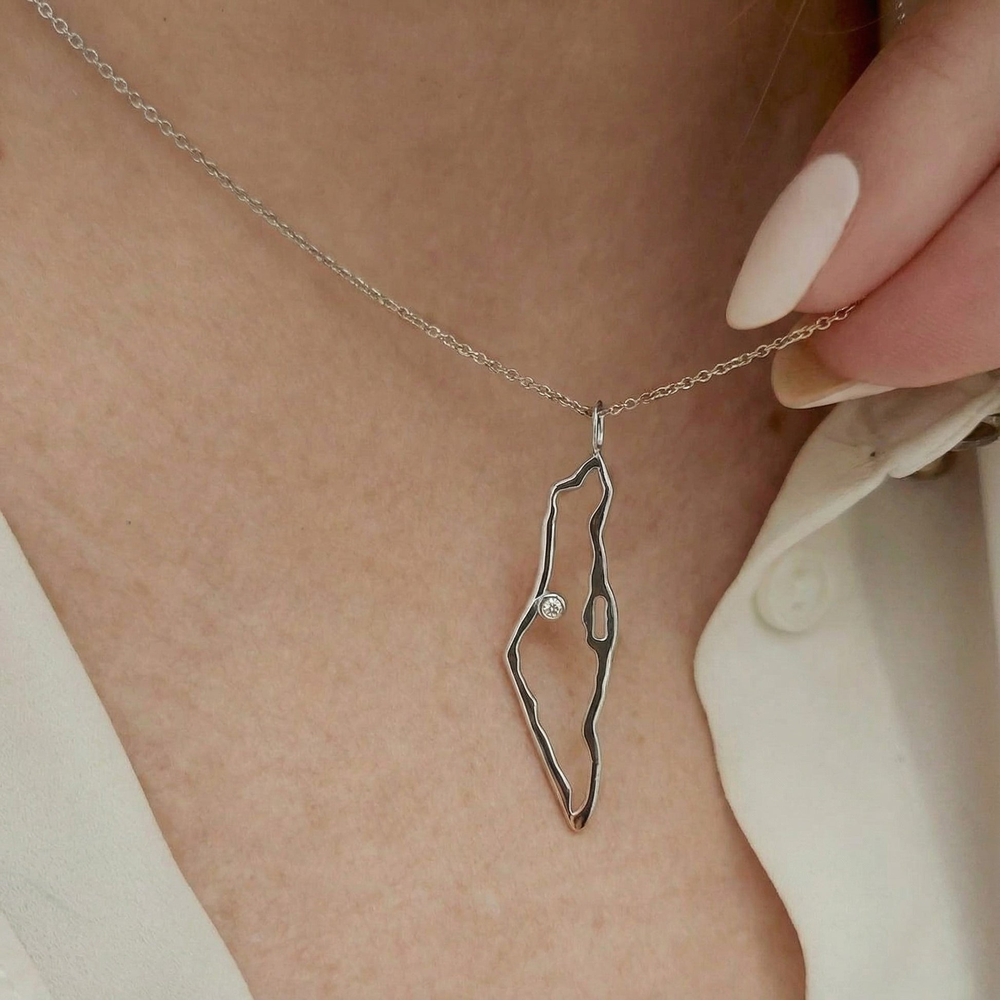 My specially designed map of Israel pendant, accented with a natural sparkly white diamond, set in a bezel setting